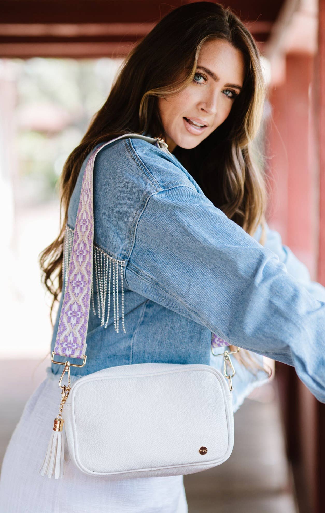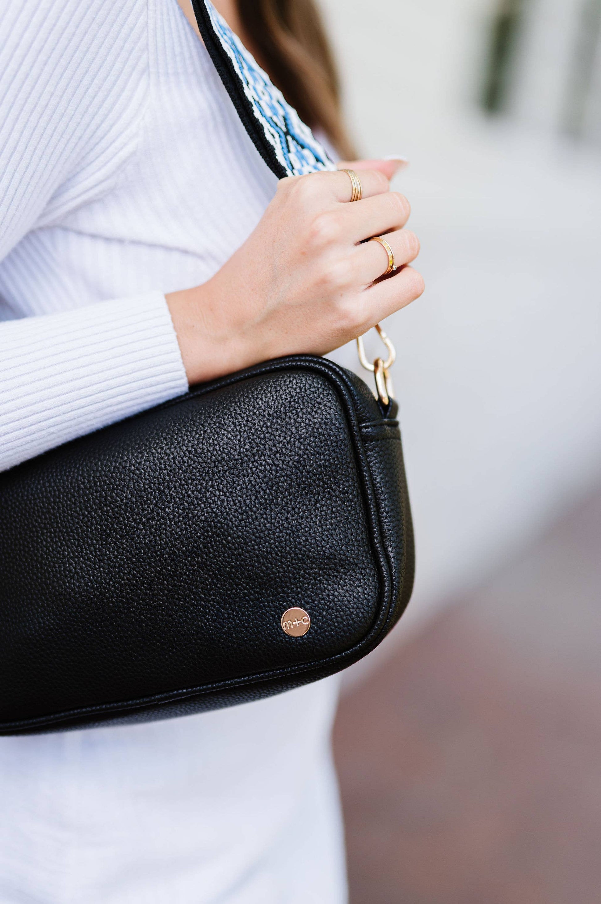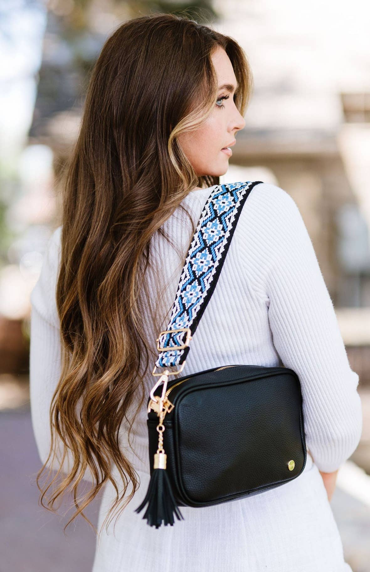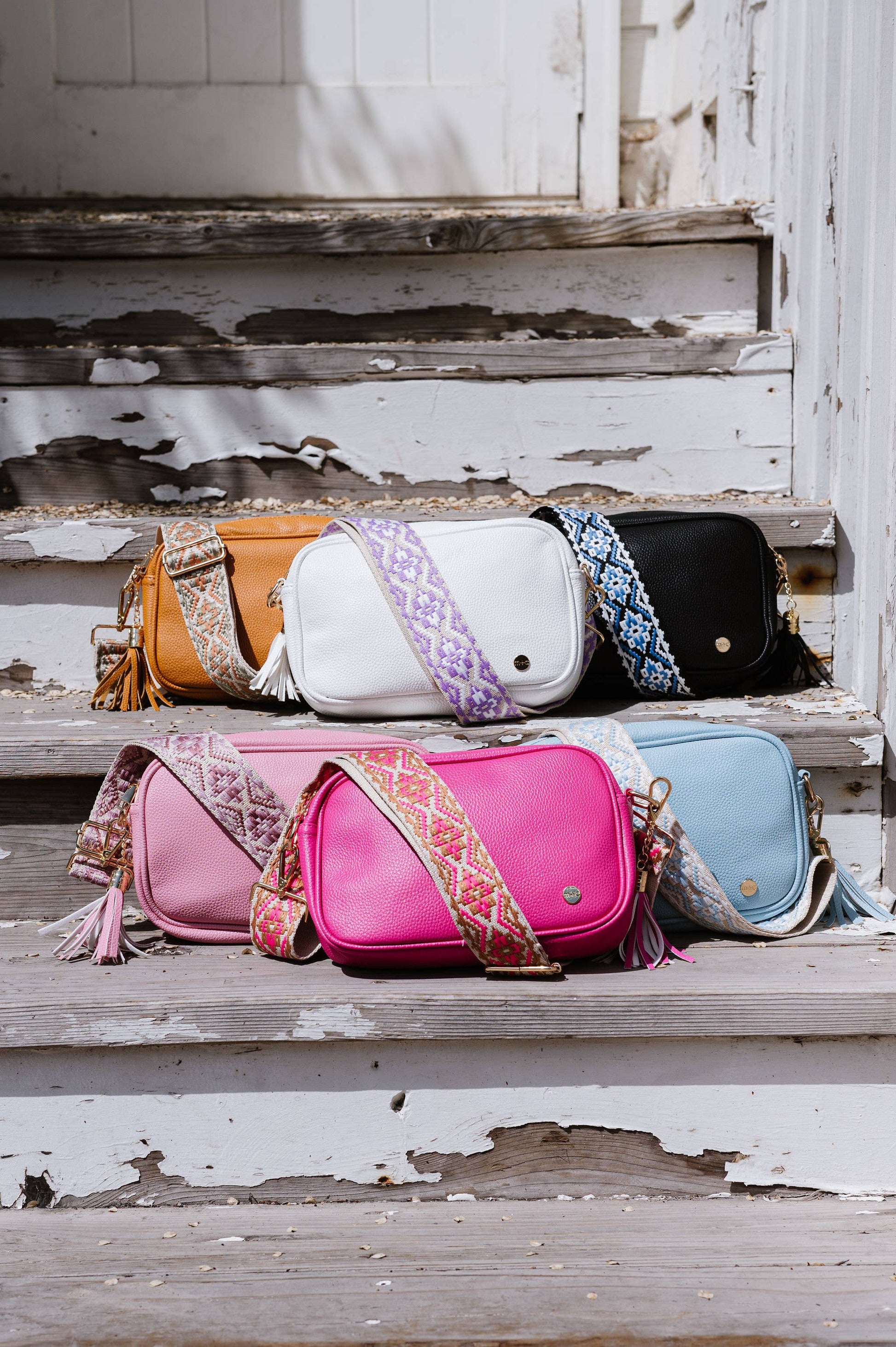 The Dolly Crossbody features two interchangeable straps, including a vegan leather option and a statement-making woven alternative, and a removable tassel, so you can customize this carryall to be a standout accessory or a complementary companion.