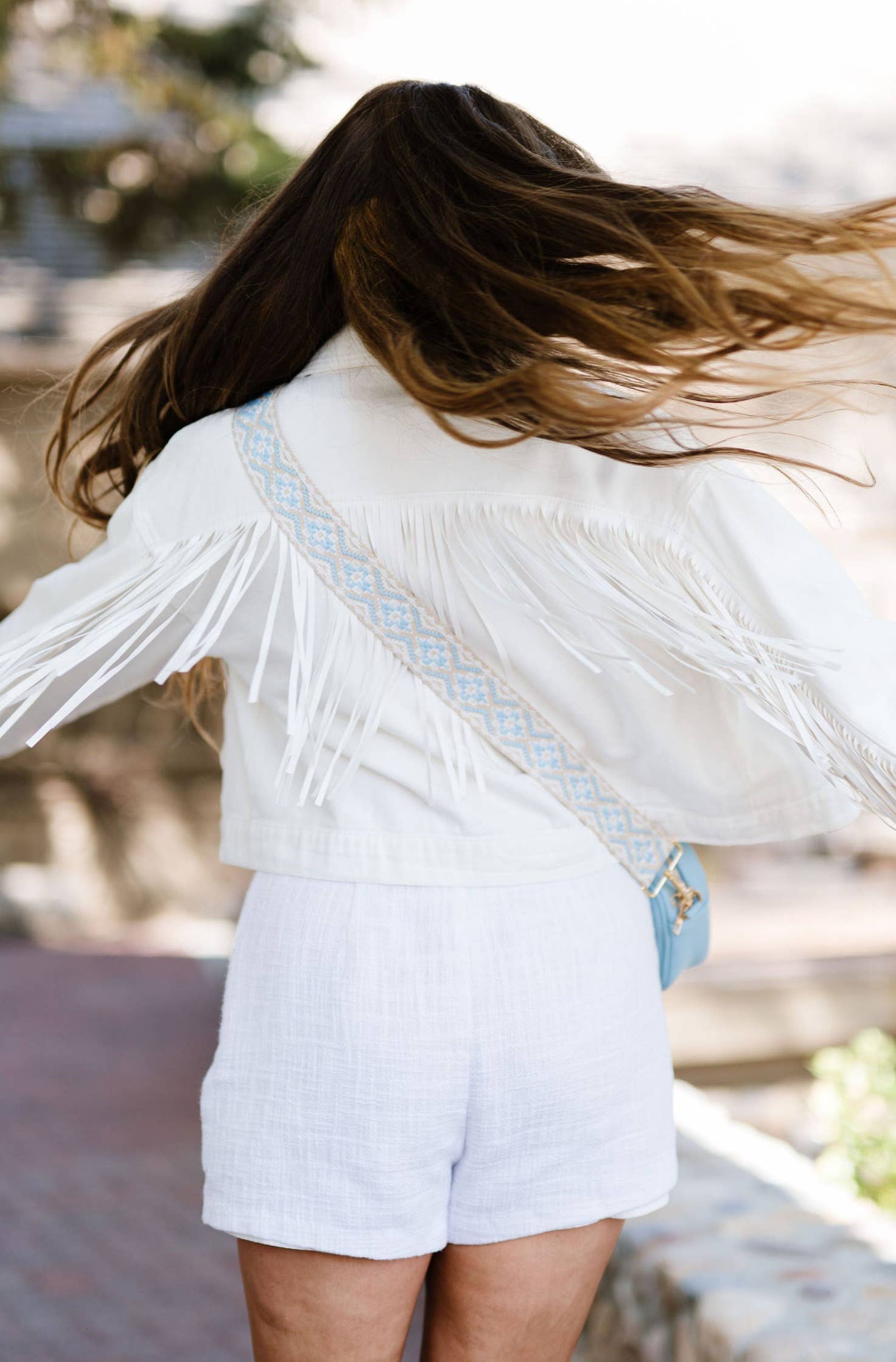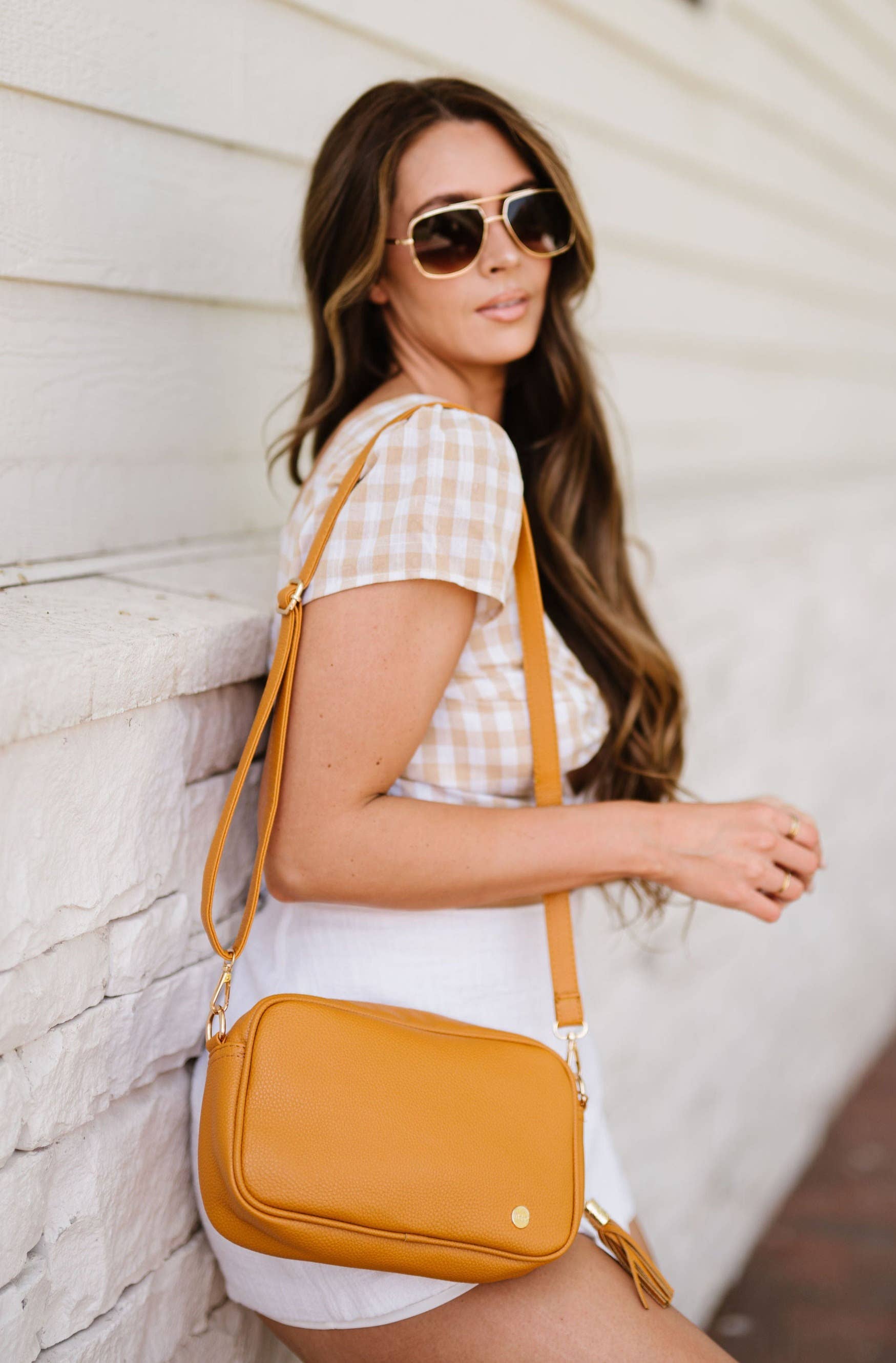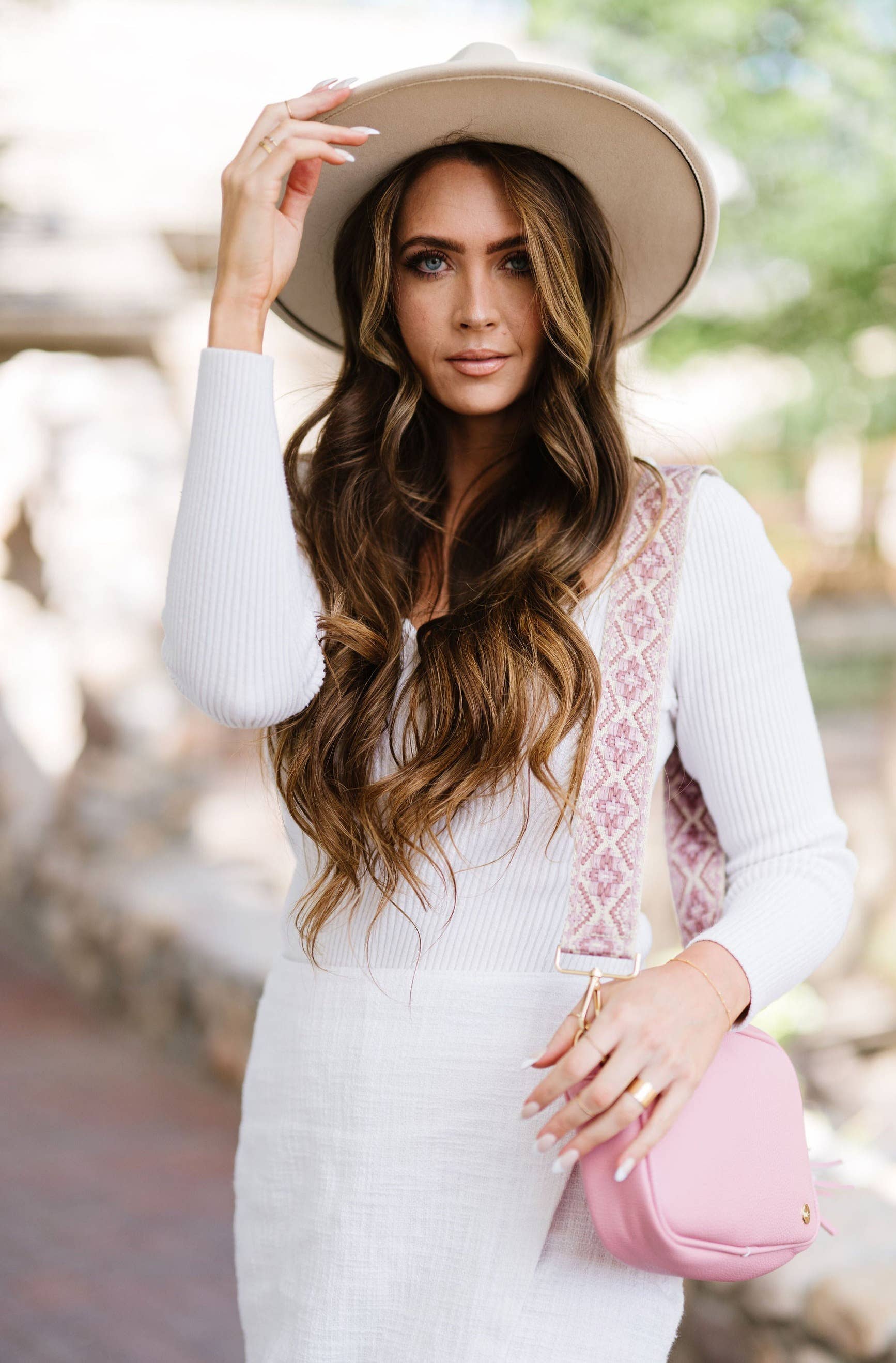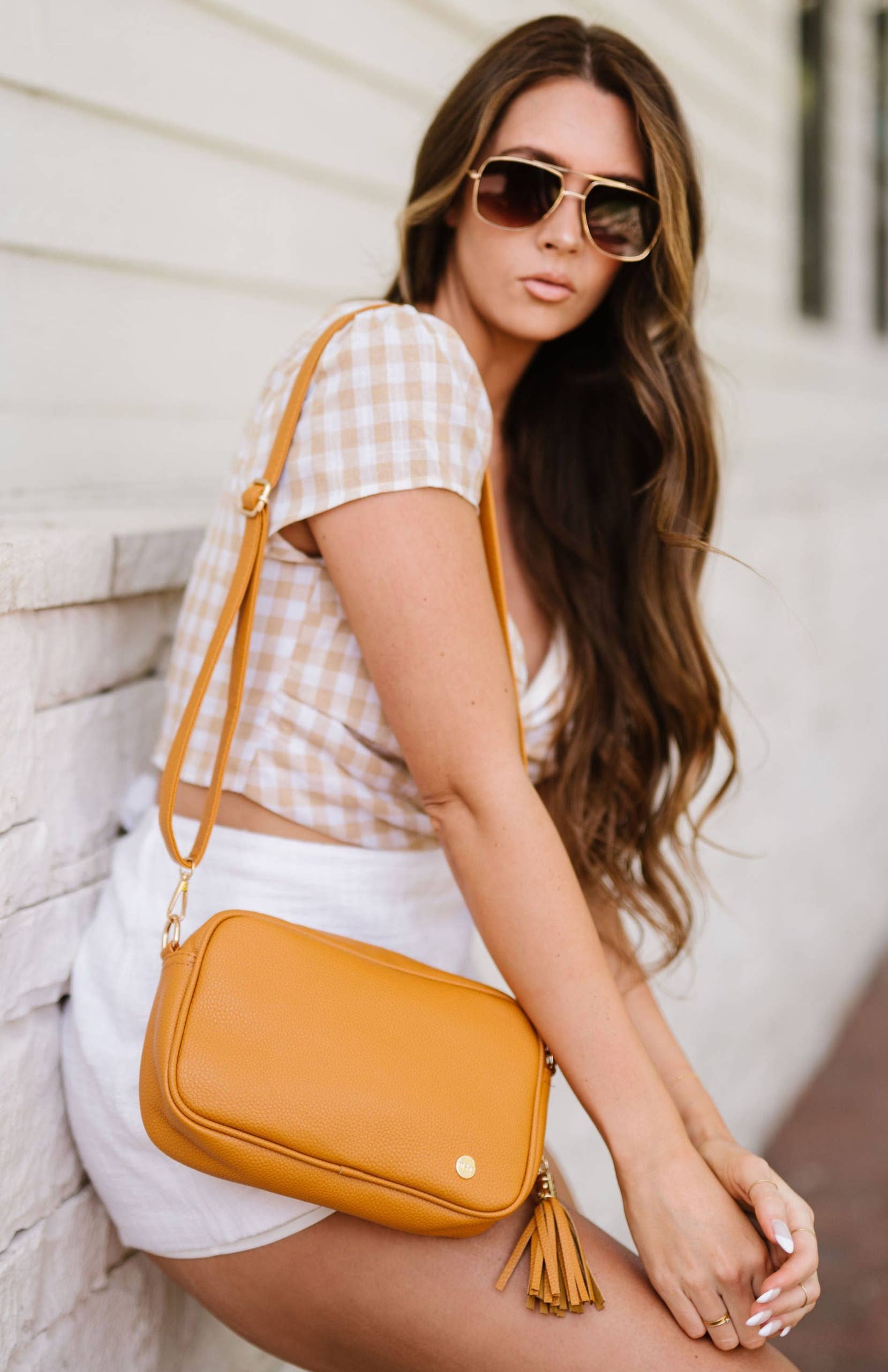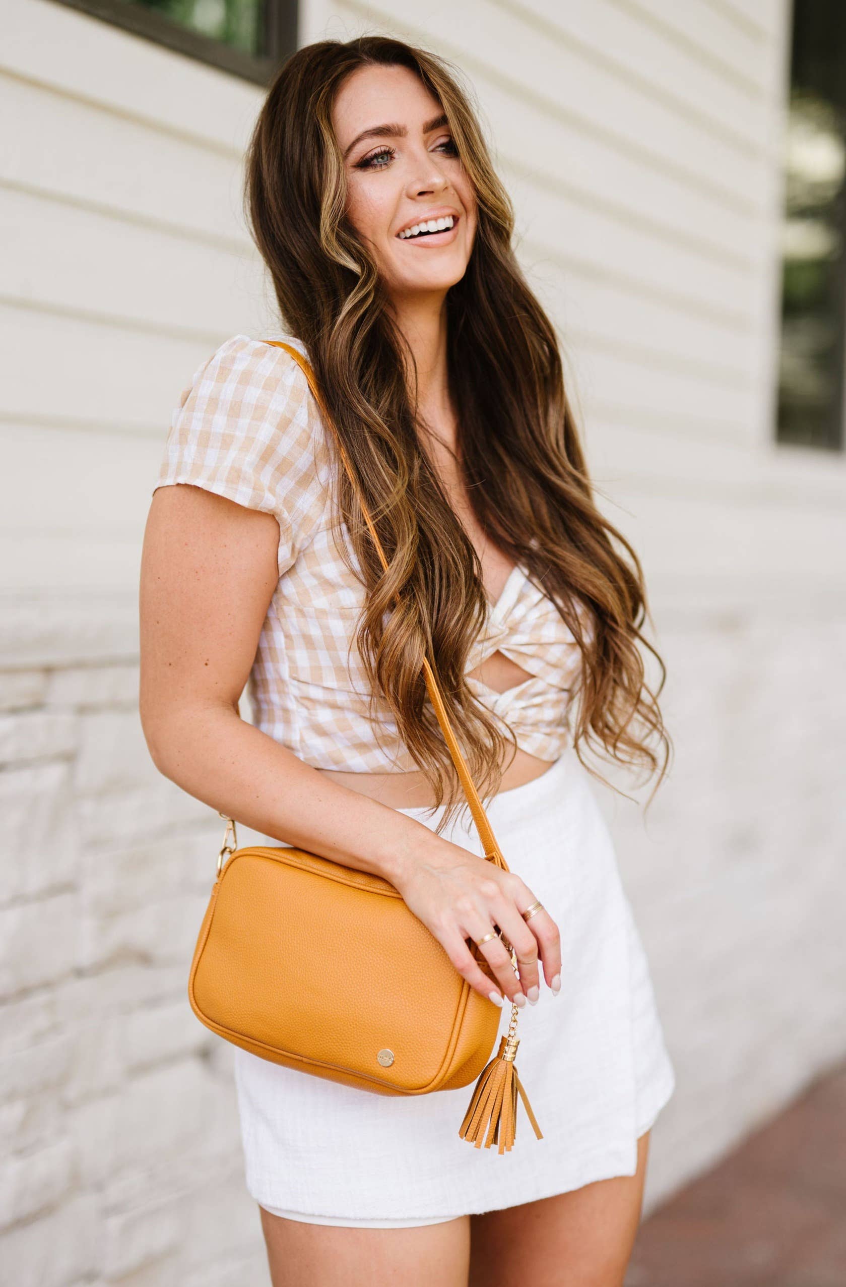 The Dolly Crossbody features two interchangeable straps, including a vegan leather option and a statement-making woven alternative, and a removable tassel, so you can customize this carryall to be a standout accessory or a complementary companion.